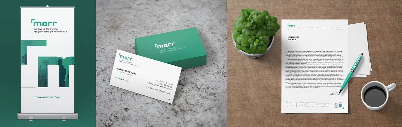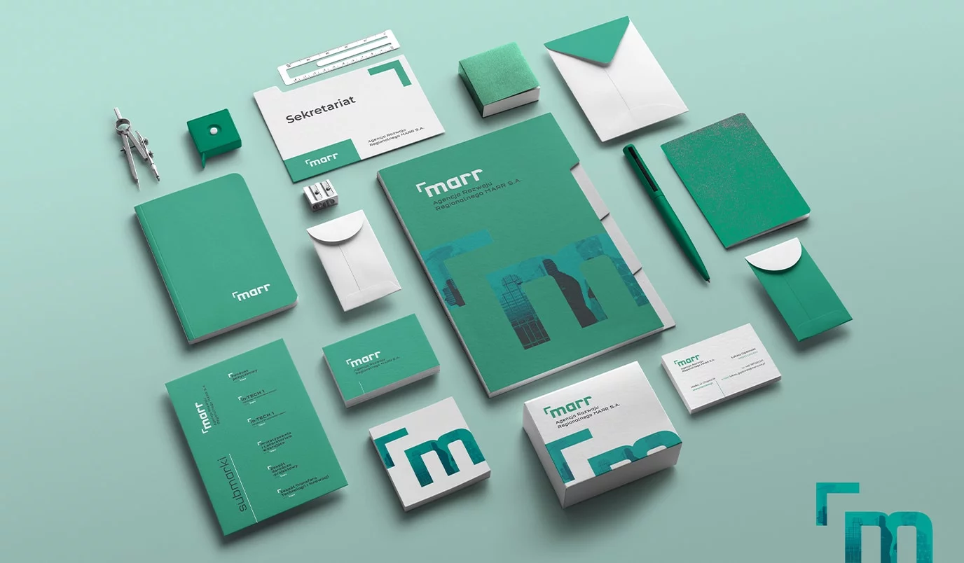 Projektowanie Identyfikacji Wizualnej: Stworzenie spójnej i nowoczesnej identyfikacji wizualnej dla MARR, w tym logo, palety kolorów, typografii oraz zestawu materiałów reklamowych i firmowych, które będą odzwierciedlać charakter i wartości marki.