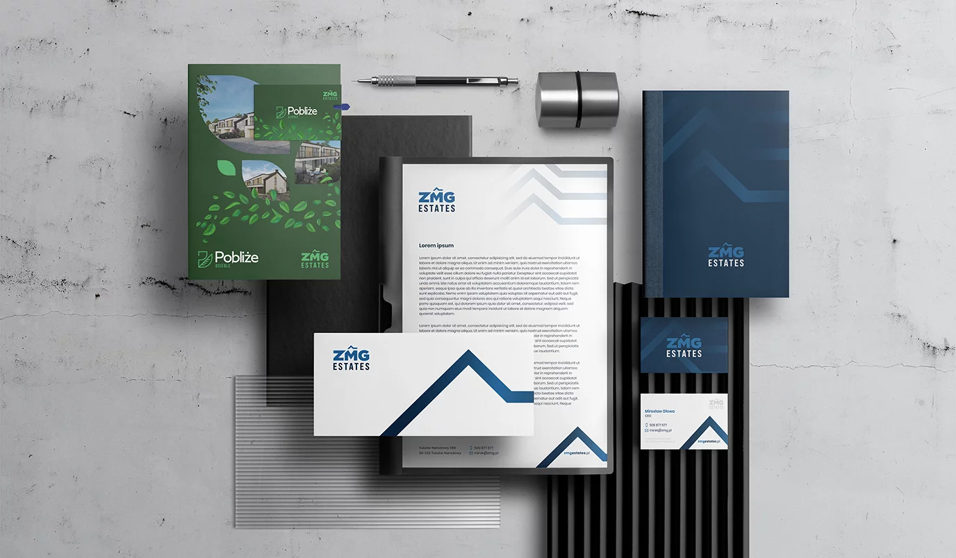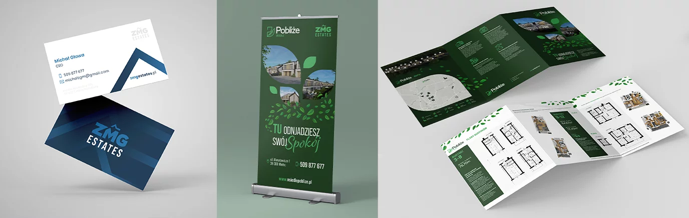Na wstępie przeprowadziliśmy szczegółową analizę rynku nieruchomości, identyfikację grupy docelowej oraz analizę konkurencji. Na tej podstawie opracowaliśmy kompleksową strategię marki dla ZMG Estates, podkreślającą ich zaangażowanie w dostarczanie wysokiej jakości usług, innowacyjność w zarządzaniu nieruchomościami oraz silne zrozumienie potrzeb lokalnego rynku. Projektowaliśmy nową identyfikację wizualną, która odzwierciedlała nowoczesność i profesjonalizm ZMG Estates. Nowe logo było czyste, nowoczesne i łatwo rozpoznawalne, co miało na celu wzmocnienie wizerunku firmy jako lidera w branży nieruchomości. Paleta kolorów, typografia i inne elementy graficzne zostały dobrane tak, aby odzwierciedlały stabilność i zaufanie, które są kluczowe dla klientów firmy. Opracowaliśmy serię materiałów marketingowych, w tym broszury, ulotki, i materiały promocyjne do użytku w biurze oraz na spotkaniach z klientami. Key visual, który został stworzony, stanowił spójny element łączący wszystkie materiały, co pomogło w budowaniu rozpoznawalnej i jednolitej marki.